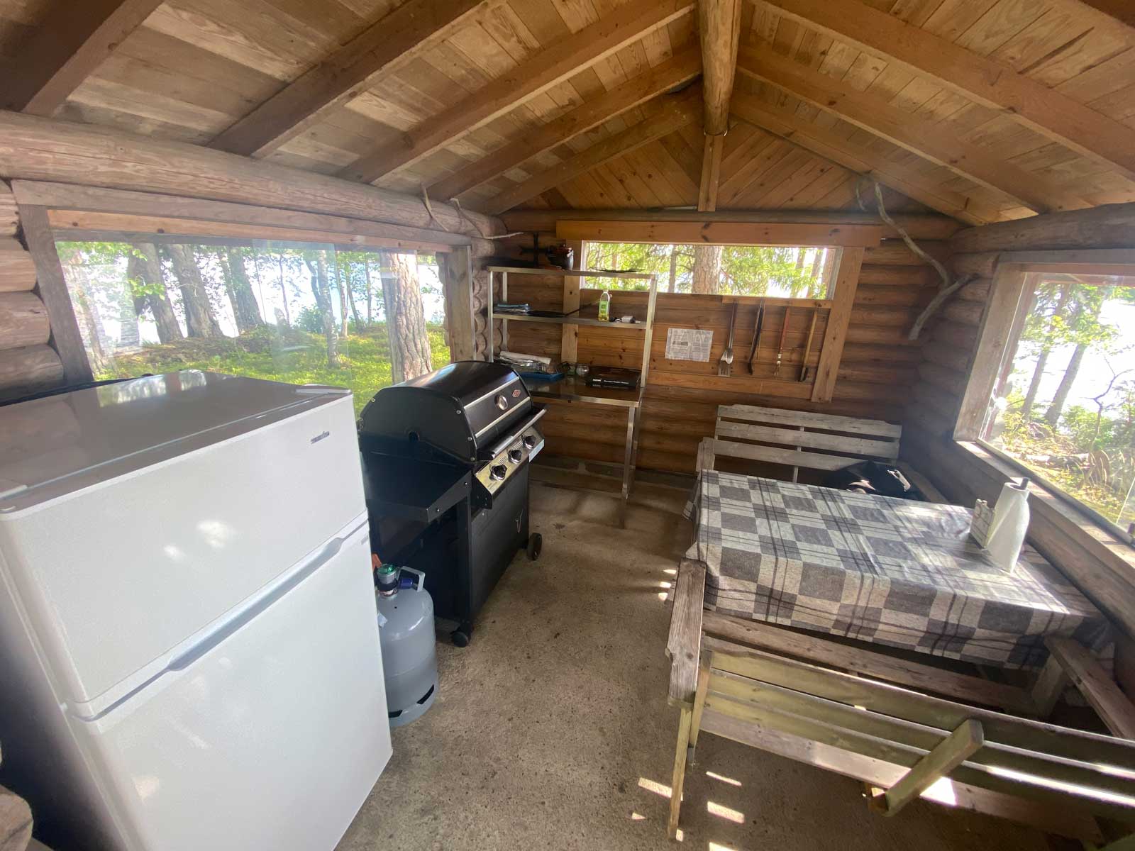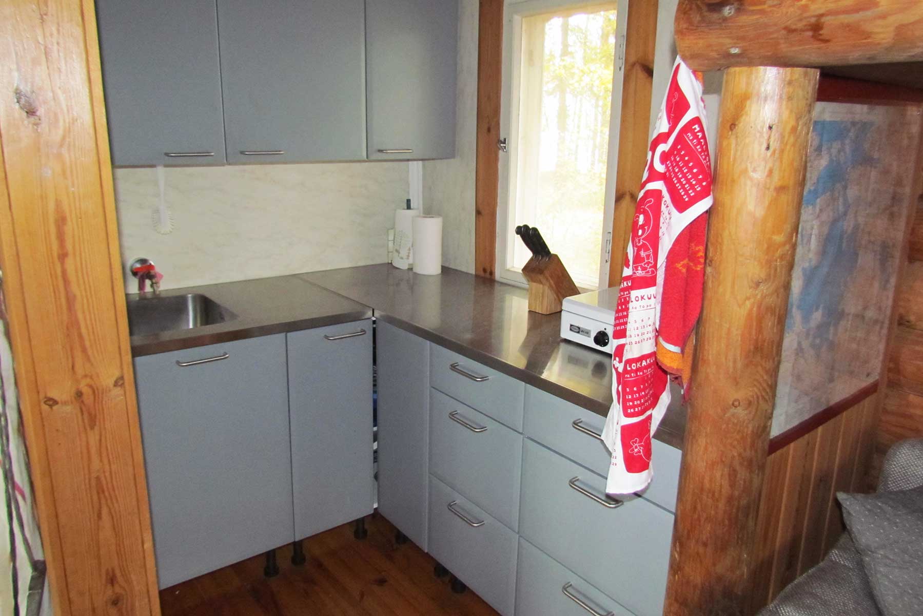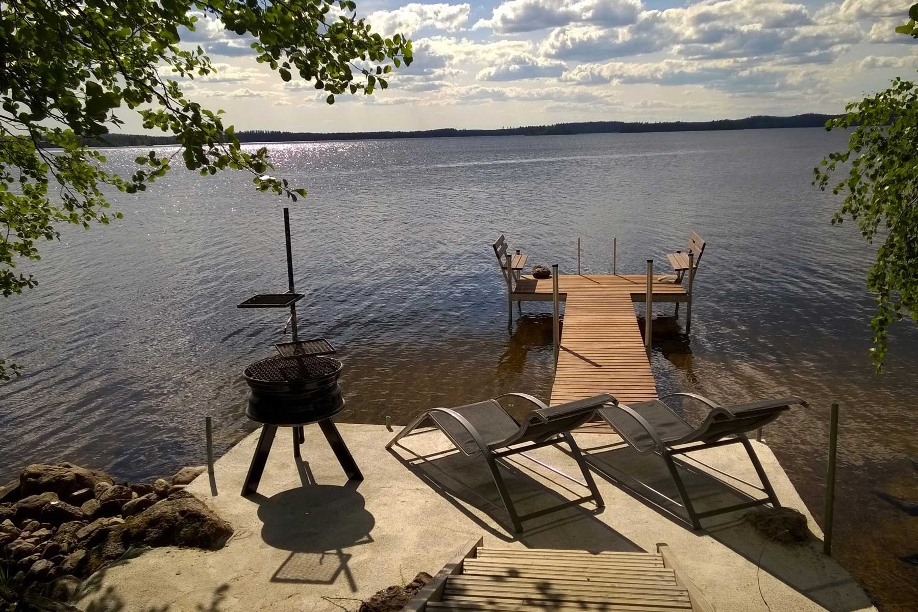 Saaren päärakennuksen tuvasta löytyy makuupaikat kolmelle sekä pieni keittiönurkkaus, joka on varusteltu kaasukeittolevyllä. Erillisestä makuuaitasta löytyy lisäksi kolme makuupaikkoja isomman seurueen tarpeisiin. Ulkona sijaitsevien kaasujääkaappien ansiosta pysyy lomaruuat kylmänä ja grillikatoksessa pystyy valmistamaan kaasugrillin avulla ruuat koko porukalle. Pihapiiristä löytyy lisäksi puugrilli, jossa järvestä saadut kalat tai kaupasta haetut makkarat kypsyvät mitä parhaiten. Puulämmitteisen saunan rentouttavissa löylyissä huolet unohtuu ja hengitys tasaantuu. Saunasta on hyvä kirmata välillä vilvoittelemaan pitkän ja vakaan laiturin kautta Enonveden puhtaisiin aaltoihin. Saari on sähköstä ja juoksevasta vedestä vapaa, joten juomavesi kannetaan kanistereissa mantereelta. Lisäksi lomailua on helpottamassa aurinkopaneeli, jonka avulla puhelimien lataus on mahdollista sekä vesipumppu, mikä vapauttaa lomalaisen käyttövesien kantamisesta.